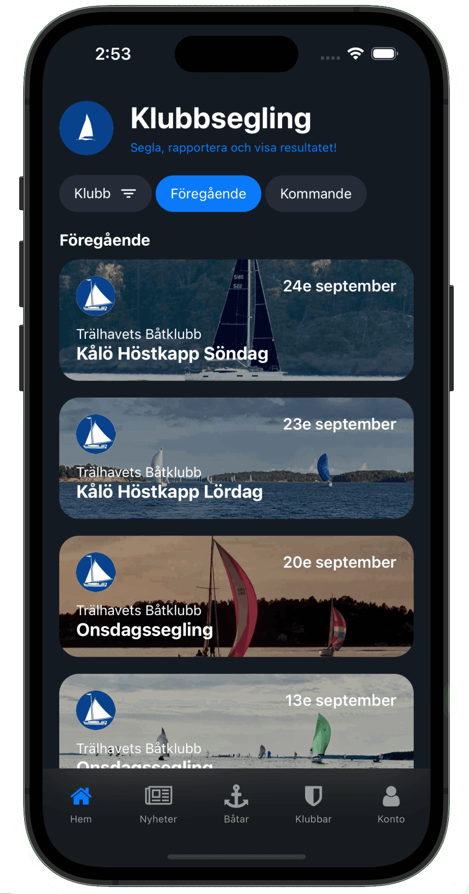 - Seglarna anmäler sig i appen och rapporterar sin målgångstid.